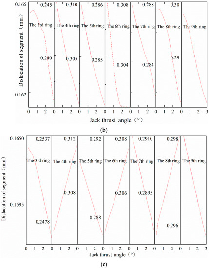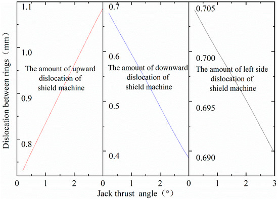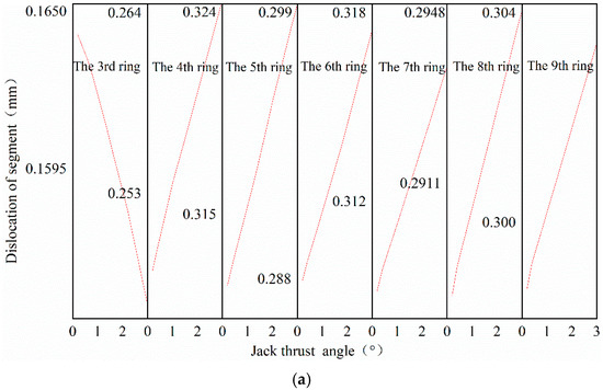 By comparing the amount of staggered platform between the four positions of the tunnel vault, arch bottom, and both sides of the arch waist, it is finally determined that the maximum amount of staggered abutment is found between the arch bottom ring and the arch bottom ring. Compared with the adjacent pipe rings, the amount of staggering between the third and fourth rings is the largest. It can be seen from Figure 15 that when the shield machine goes up, the maximum amount of staggering between rings increases linearly with the increase of jack thrust deflection angle, and the rising slope is 0.127 mm/°. When the shield machine goes down and left, the maximum amount of staggering between rings decreases linearly with the increase of Jack thrust deflection angle, and the decline rate is −0.105 mm/° and −0.005 mm/°.