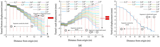 It can be seen from Figure 14a that when the shield machine goes up, the displacement of the tunnel vault and arch bottom develops vertically and downward (the opposite direction of the Z-axis) is consistent with the stress direction. The influence degree of the jack thrust angle decreases with the increase of the distance from the shield machine and finally tends to be stable. The vertical displacement of the tunnel increases by 51.4%, and the rising slope is 1.82 mm/°. The vertical deformation increases with the increase of the distance from the shield machine and finally approaches 6.83 mm, and it is not affected by the jack thrust angle. From Figure 14b, when the shield machine goes down, the displacement of the tunnel vault and arch bottom vertically upward (Z-axis downward) is consistent with the stress direction. The variation law of the influence degree of the jack thrust angle with the distance from the shield machine is the same as that of the upward direction of the shield machine. The results show that the displacement of the arch crown and arch bottom decreases with the increase of the jack thrust deflection angle, and the vertical displacement of the tunnel on jack’s action surface decreases by 43.9%, and the decline slope is 1.08 mm/°. The vertical deformation increases with the increase of the distance from the shield machine and finally approaches 7.03 mm, which is not affected by the jack thrust deflection angle. From Figure 14c, the displacement of the left and right sides of the tunnel moves horizontally to the right (in the opposite direction of the R-axis), which is consistent with the stress direction. The influence of the jack thrust angle decreases with the distance from the shield machine and finally tends to be stable. The displacement of the left and right sides of the tunnel increases with the increase of the thrust deflection angle of the jack. The horizontal displacement of the working surface of the jack increases by 1750.3%, and the rising slope is 1.31 mm/°.