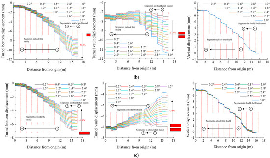 Tunnel displacement and transverse deformation. (a) Upward direction of shield machine. (b) Downward direction of shield machine. (c) Left direction of shield machine.