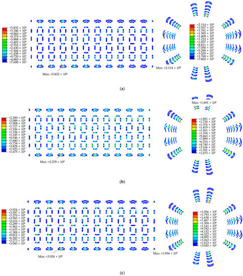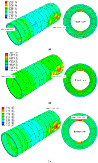 Maximum stress of segmental lining structures. (a) Upward direction of shield machine. (b) Downward direction of shield machine. (c) Left direction of shield machine.