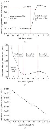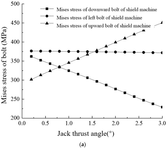 It can be seen from Figure 18a that the maximum von Mises stress of all bolts in the tunnel increases linearly with the increase of the jack thrust angle when the shield machine goes up, and the increase slope is 53.28 MPa/°. When the shield machine goes down and left, the maximum von Mises stress of bolts decreases linearly with the increase of jack thrust angle, and the descending ramps are −47.83 MPa/° and −1.6 MPa/°, respectively. From Figure 18b–d, when the shield machine goes up and down, the position where the maximum principal stress of the segment appears is continuously changing and finally stays at the 2nd–3rd ring. When the shield machine runs on the left, the maximum principal stress of the segment appears on the inner side of the 1tenth ring vault. When the shield machine goes up, the jack thrust deflection angle is within 2.2° and does not exceed the ultimate material strength. When the shield machine goes up, the arch waist position on the right side of the joint between the second and third rings is on the right side. When the shield machine goes down, the maximum principal stress of the segment decreases rapidly within 1.2° of jack thrust deflection angle, and it is basically stable at 2.23 MPa after exceeding 1.2°, which is less than the ultimate strength of the material. When the shield machine goes left, the maximum principal stress of the segment decreases linearly with the increase of jack thrust angle.