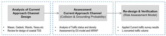 The design of the fairway should consider both safety and economic feasibility, and check whether the vessel is safe from the risks of collision and grounding, in accordance with changes in the marine traffic environment. For this purpose, in this study, a previously established fairway evaluation was conducted, using a model to evaluate the collision and grounding probability of a vessel, and the feasibility of the evaluation according to environmental changes was reviewed [19]. Figure 1 shows a flow chart of this study.
