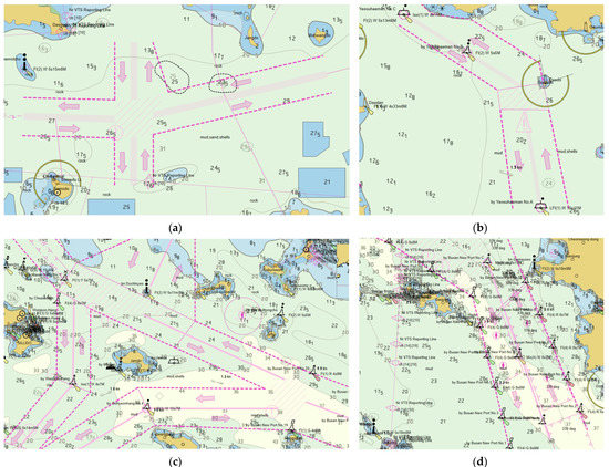 (a) Wando Port access and crossing fairways near the Wando Port, (b) Yeosu Area fairways in traffic safety-specific waters, (c) Masan Fairway connecting Masan Port, Jinhae Port, and Tongyeong Port, and (d) Gadeok Fairway Near Busan New Port.