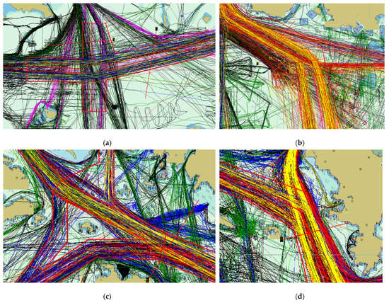 (a) Maritime traffic flow in the entrance and crossing fairways near Wando Port, (b) maritime traffic flow in the Yeosu area in specific traffic safety waters, (c) maritime traffic flow in the Masan fairway, and (d) maritime traffic flow in the Gadeok fairway.