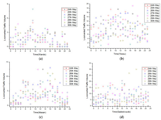 (a) L-converted traffic volume by time in the Wando fairway, (b) Yeosu area in Specific Traffic Safety Waters, (c) the Masan fairway, and (d) the Gadeok fairway.