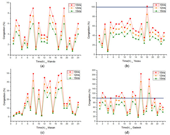 As the degree of congestion is a comparison of the actual traffic capacity with the actual maritime traffic volume, 100% means that ships are passing at the practical traffic capacity, and because the fairway is saturated, the traffic of ships is concentrated at a specific time. Thus, it is necessary to disperse the constant mass. According to Figure 3b,d, we found that congestion on the Yeosu fairway and Gadeok fairway was over 100% at a specific time; thus, it was analyzed that it is necessary to solve the congestion of the fairway. Table 6 shows the average hourly congestion and peak-time congestion evaluation results for each fairway.