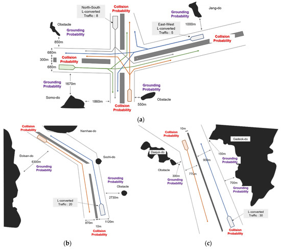 Figure 7a shows the collision and grounding risk assessment scenario for the Wando fairway. Scenarios were set up to allow ships to navigate in all directions according to the characteristics of the fairway, where vessels travelling in the east–west and north–south directions crossed. In addition, obstacles such as Jangdo on the upper side of the ship passing east–west, and obstacles at a distance of 550 m below the north–south fairway, were reflected in the grounding probability evaluation scenario. According to the results of the maritime traffic survey, 8 L-converted traffic per hour was set to pass. Figure 7b shows the evaluation scenario for the Yeosu fairway. There is a risk of collision and grounding due to the presence of Sochido near the right side of the fairway, and the scenario reflected this. According to the results of the maritime traffic survey, 20 L-converted traffic per hour was set to pass. Figure 7c shows the evaluation scenario for the Gadeok fairway. The width of the left passage is 770 m, and that of the right passage is 900 m. The obstacle closest to the right passage is 150 m to the west end of the Gadeok Island, and the obstacle closest to the left passage is 300 m to the right end of Daejuk Island. According to the results of the maritime traffic survey, we found an L-converted traffic volume of 30 ships per hour. Figure 7d shows an evaluation scenario for the Masan fairway. As shown in the previous analysis, the Masan Passage is a complex water area with vessels passing through Jinhae Port, Masan Port, and Tongyeong Port. According to the results of the maritime traffic survey, it was established that there is an L-converted traffic volume of 13 ships per hour.
