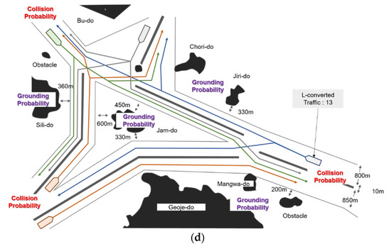 (a) Collision risk and grounding probability evaluation scenario of the Wando fairway, (b) the Yeosu fairway, (c) the Gadeok fairway, and (d) the Masan fairway.