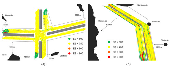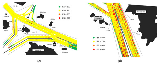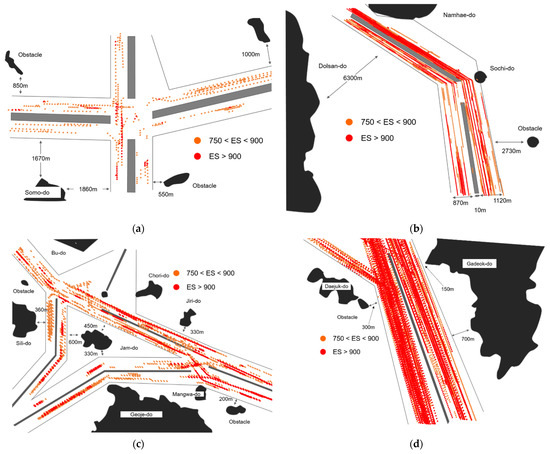 (a) Distribution map of ES ≥ 750 for the Wando fairway, (b) the Yeosu fairway, (c) the Masan fairway, and (d) the Gadeok fairway.