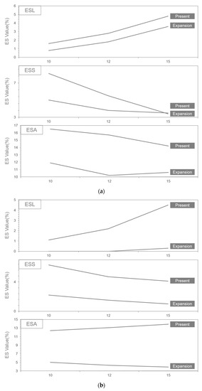 In all three fairways, the ES Value decreased when the fairways were expanded overall. As for the characteristics of and , increased and decreased as the vessel speed increased. If we consider whether , which is a comprehensive environmental stress, follows the trend of or as the ship speed increases, it can be seen whether the fairway has a large influence on the vessel traffic volume, or whether the characteristics of the fairway affect the ship safety. In the case of the Figure 11a Yeosu fairway and Figure 11c Gadeok fairway, the value was found to be greatly affected by the vessel traffic volume, as the ES value decreased as the vessel speed increased. In particular, in the case of the Gadeok fairway, the ES value of decreased overall; however, the shape of the graph was similar to that of the , indicating that the amount of traffic of the vessel had a great influence on the results. In contrast, in the case of the Masan fairway in Figure 11b, the ES value of the increased as the ship speed increased in the current state, and the fairway was found to be significant affected by the fairway characteristics. When the width of the fairway was expanded, the ES value of significantly decreased, and the ES value of showed a downward trend as the ship speed increased. In addition, the overall value fell from more than 10% before the expansion to less than 10% after the expansion; thus, the risk was significantly improved only by expanding the fairway width.