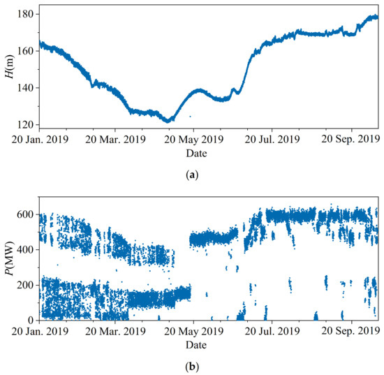 To verify the effectiveness of the proposed method, a large-scale FTU in the actual engineering environment was selected as the research object. This section begins with a brief introduction to the basic information of the FTU. Then, the long-term monitoring records of the water head (), the active power () and the vibration amplitude () of the top cover were obtained from the computer monitoring system of the hydropower station to form the raw data set. Next, anomaly samples in the raw data were removed based on DBSCAN. In addition, the GRUD–WGAN model was established to fill in the missing values. On this basis, the health state probability model of FTU was constructed based on the GPR algorithm, and the NLLP was defined as the PDI of the FTU. Finally, the TPA–LSTM model was built to realize the degradation trend prediction of the FTU.