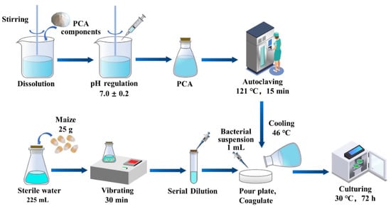 - Preparation of the bacterial suspension: Briefly, 25 g maize sample and 225 mL sterile water were put into a 500 mL conical flask. The conical flask was placed in an oscillator and vibrated for 30 min at a speed of 10,000 r∙min−1. The aim of this process was to fully diffuse the microorganisms on the surface of the maize kernels into the sterile water. By this process, a homogenate with a concentration of 1:10 was obtained;