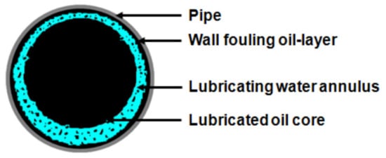In practice, sufficient knowledge of pressure gradients or frictional pressure losses in pipes is needed to develop an energy-efficient transportation system (e.g., to determine the optimal size of pipes and pumps that can control various flow conditions throughout the lifetime in the field). Arney et al. [1] introduced a friction loss model for pumping heavy oils in a lab-scale horizontal pipeline with the application of an idealized CAF technology. Although this model could predict a large CAF dataset with acceptable precision, it failed to do so for the self-lubricated flow (SLF) of bitumen froth (which represented a commercial-scale application of this water-lubricated flow technology). Joseph et al. [2] investigated the SLF phenomenon to develop their own empirical model based on data generated from the lab- and pilot-scale experiments. A 35-km long SLF pipeline was designed, commissioned, and operated based on this model in Athabasca by Syncrude Canada Ltd. The SLF involved intermittent water lubrication with the oil-rich core frequently touching the pipe wall. Meanwhile, for CAF, this kind of contact was negligible, and the lubrication was continuous. Rodriguez et al. [3] applied CAF in a pilot-scale pipeline. Although proper attention was paid to eliminating wall-fouling, it was a natural consequence of water lubrication and could not be excluded from the large-scale water-lubricated pipeline transportation of viscous oils. Based on the data produced from CAF experiments, both with and without wall-fouling, a new semi-mechanistic two-parameter model was proposed to assist with friction losses. The model was claimed to perform better than similar models. However, it failed to provide satisfactory results for the water-assisted flow (WAF) of unconventional heavy oils [4,5,6]. WAF refers to large-scale applications of CAF that involve wall-fouling (Figure 1). It is a commercially applicable mode of the flow technology. One of the most significant technical challenges facing the industrial application of WAF is the necessity of a model that can reliably predict frictional pressure losses. Previously proposed models for various modes of water lubrication are not necessarily applicable to WAF pipelines. Applications of existing analytical models to different WAF datasets produce unreliable results, with errors as high as 500% [5]. This is because most of these models are empirical and were developed using system-specific data. An exception is the phenomenological model proposed by McKibben et al. [7]. It is probably the best analytical model for WAF systems. A concise description of the model is included in Section 3.1.