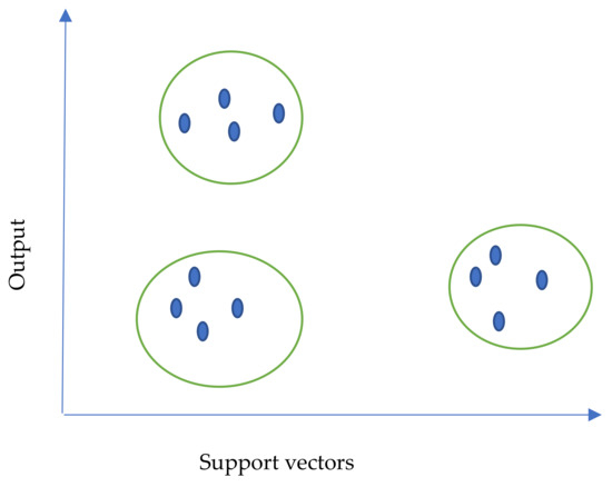 SVM is a popular supervised machine learning method of AI, particularly in the field of classification. However, it is also commonly used to predict real-values in regression problems [24]. This technique works on defining hyperplanes of maximum variation/margin within the datasets using a kernel function, as shown in Figure 2. The basic equation for an SVM is similar to that of any regression (as shown in Equation (2)), apart from the application of a kernel function in the regression model. Hence, the resulting model takes the form of Equation (3).