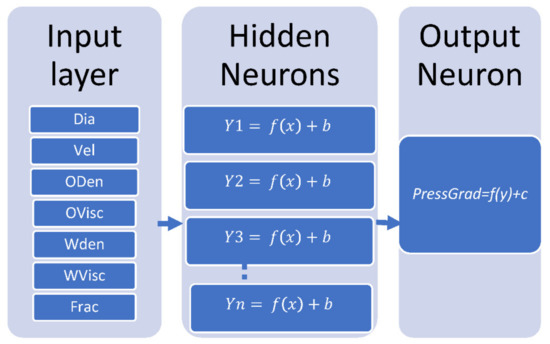Osman and Aggour [12] propose an artificial neural network (ANN) model to estimate pressure gradients in horizontal and quasi-horizontal multiphase pipes. The model was constructed and then tested on more than 450 field-derived test data samples. Its accuracy was then compared with the available correlations as well as mechanistic models to show the superiority of the used ANN technique. Similarly, Adhikari and Jindal [13] also developed an ANN to estimate the pressure gradient losses for the non-Newtonian fluid food which was passing through a tube. The proposed model was able to predict the measured values of pressure gradients with an absolute average error of less than 5.44%. Ozbayoglu and Yuksel [14] used ANN instead of a traditional modeling approach to investigate the flow types and also the frictional pressure losses of a mixture of two phases (gas and liquid) flowing within a horizontal ring-shaped conduit. The outcome showed that the ANN can predict flow patterns with errors of less than ±5% and friction losses with an accuracy of ±30%. Salgado et al. [15] tried to estimate the volume fractions of triphasic flows by applying ANN and the nuclear technique. From the three investigated flow regimes of oil-water-gas (stratified, annular, and homogeneous), the ANN model could adequately relate the measurements which simulate the MCNP-X aided code that uses volume fraction for each of the components in the three-phase flow system. Nasseh et al. [16] also used ANN in genetic algorithms to estimate the pressure gradients in multiple flows under a Venturi scrubber based on a two-phase ring flow model. Successful implementations such as those described above strongly indicate that ANN approaches can be extended to other multiphase flow systems. Dubdub et al., (2020) [17] applied a feed-forward neural network with a backpropagation technique to model water-lubricated flow of non-conventional crude. Even though it was a pioneering study, the authors used more than 20 nodes. The ANN model was complex and vulnerable to overfitting.