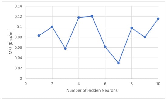 For the current study, seven neurons arranged in a single hidden layer were identified to produce most optimum results. To achieve this result, number of neurons in the hidden layers was changed from 1 to 10 and its effects on MSE for validation dataset were observed, which is shown in Figure 4. Validation dataset comprises of randomly selected samples from the available dataset which is used for determining the appropriateness of model architecture. The model architecture is not selected on the basis of accuracy for training dataset to ensure that the model can be robustly used for unknown values. It was observed that MSE with seven neurons produced the optimum results. It should be noted that MSE is used as the default for determining weights and biases for hidden neurons and this is the reason it was used for determining optimum number of hidden neurons. This number depends upon the complexity and nature of modeling problem and the the trial-and-error method, as described, is generally used to determine the appropriate number of hidden neurons [31].