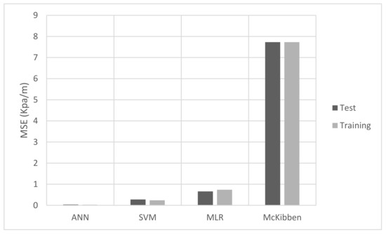 The comparison of accuracy measures presented in Figure 6 and Figure 7 demonstrates that the ANN model performs much better than the other models, providing the least MSE and MAPE, and highest CC. Also, all models have shown negligible differences between training and test datasets in terms of MSE and CC values. However, the difference in MAPE was very significant for SVM and MLR while it was very low for ANNs. This could be an indication of the better robustness of ANN as compared to other models. In comparison to the soft techniques investigated in the current study, the model used by McKibben et al. Study [7] does not perform well, although it is most likely better than other analytical models for the WAF of unconventional oils [4,6,22]. This observation was confirmed for the training as well as the test datasets. The test dataset was not used for the development of models in this study hence comparison of their accuracy is deemed fair with the analytical model that was developed using a different dataset. This finding justifies the need to employ AI-based models for designing WAF pipeline systems. The analytical model seems to have inadequate generalization capability, although it was developed based on an in-depth analysis of the physics. As a result, the application of an analytical model, such as Equation (1) for designing a WAF system results in a high degree of uncertainty that is unfavorable to both the economic and technical feasibility of an engineering project.