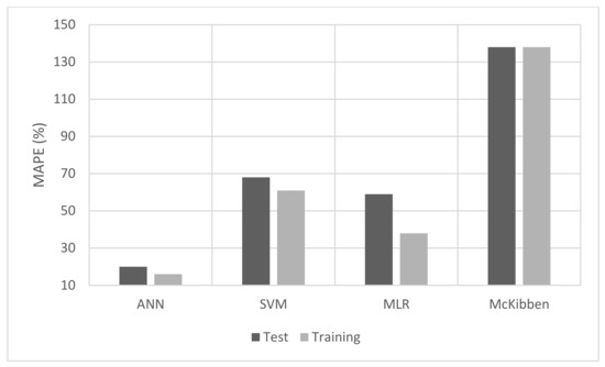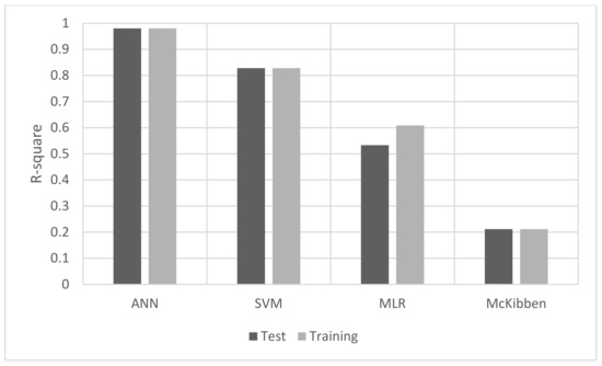 The respective performances of the models developed in this study are presented in Figure 5, Figure 6 and Figure 7. The analytical model proposed by McKibben et al. [7] was also applied to the dataset, and its accuracy measures are also included in the comparison.