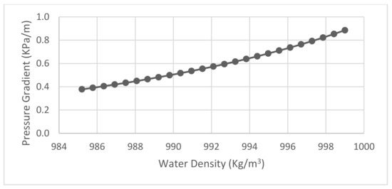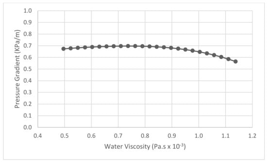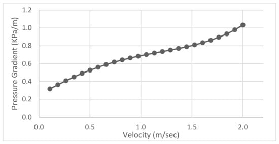 As ANNs were shown to be the most accurate model for predicting pressure gradients in this study, they were used to conduct a sensitivity analysis so that each input variable’s relationship with the output variable can be identified. Figure 8, Figure 9, Figure 10, Figure 11, Figure 12 and Figure 13 represent changes in the pressure gradient for changes in each variable as per the current ANN predictions. This analysis was performed by applying the ANN model developed in this study with varying values of one independent variable at a time, while others were kept constant at their average values. For example, if velocity was observed to affect the pressure gradient, then all other parameters were fixed at their average values (as shown in Table 1), while velocity was changed within a predetermined range. This approach for sensitivity analysis was employed in previous studies as well e.g., [17,32].