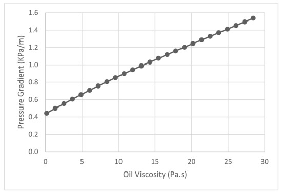 As shown in Figure 8, Figure 9, Figure 10, Figure 11, Figure 12, Figure 13 and Figure 14, average velocity and oil viscosity have positive effects on the pressure gradient. Specifically, increasing the magnitudes of these variables tends to increase friction losses. The boosting effect of velocity is highly evident in fluid dynamics studies. It should be mentioned that ΔP/L is proportional to V2 for a single-phase pipe flow. The impact of oil viscosity is a WAF-specific phenomenon. Higher oil viscosity most likely increases the degree of wall-fouling, thereby increasing ΔP/L [4,5,7].