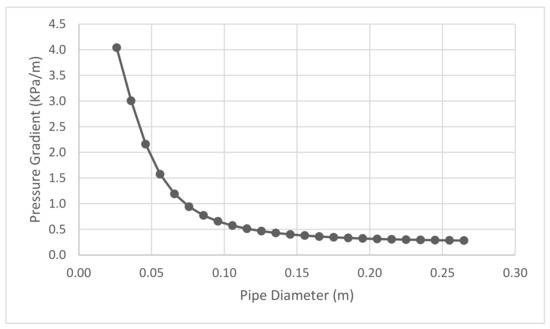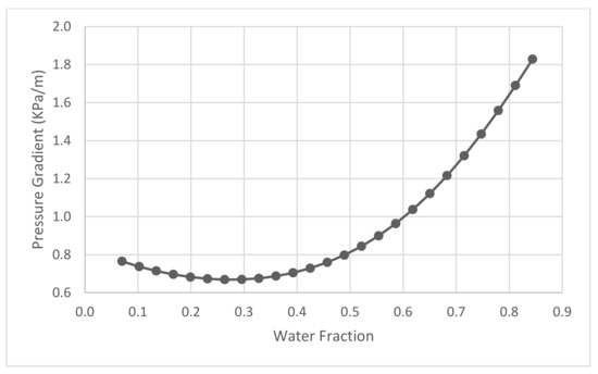 Water viscosity did not have a significant impact on pressure losses, as its magnitude was essentially constant (~1 mPa.s). Similar to water viscosity, water fraction was found to have a negligible effect on friction losses. A detailed analysis of the experimental measurements also demonstrated comparable results [30]. Pipe diameter had an inverse influence on the WAF pressure gradient, which was expected since there is a nearly proportional correlation between ΔP/L and D−1 for the single-phase flow in a pipeline.