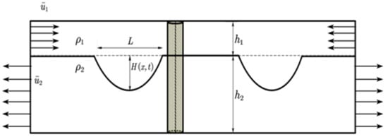 The left boundary was set to x = 0, while the right boundary velocity condition was set similar to the left but in the opposite direction. Since the amplitude scale of internally isolated waves is much larger than that of surface waves, the study of internally isolated waves often assumes that the upper surface is an undeformable wall, called the “rigid cover assumption.” In this paper, we consider the computational domain for the force of the riser pipe running through the bottom of the sea, while doing comparison with the experimental water tank results, the bottom boundary is also set as the wall boundary. The front and rear boundaries were set as standard, the velocity derivative was zero, and the riser surface was set as a wall, speed at the wall is 0 The initial internal solitary wave positions are located at the left and right boundaries. The fluid is incompressible, the interface between the upper and lower layers uses the fluid volume method (VOF), and the turbulence model is the K-epsilon model. The characteristic wave parameters are summarized in Table 2.