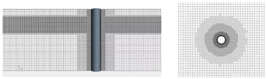 Figure 4 shows the whole grid division. The foundation size was set to 0.05 m, and the grid size of the wave surface area used the medium parameter presented in Table 1. The Z-direction was used as the central axis at the center of the riser, and the dense cylindrical areas were set with diameters 0.04 m, 0.08 m, and 0.16 m. The grid sizes were 0.002 m, 0.004 m, and 0.008 m. In this way, the stepped encryption method reduces the number of overall grids, speeds up the calculation time, and does not distort the flow field near the riser that could result in erroneous results.