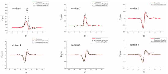 The comparative results show that the simulated horizontal force on riser section 1 was much smaller than the experimental value. In the actual experiment, there was air interference in the upper layer of the liquid level. However, in the numerical simulation, the top boundary of the calculation domain was assumed to be the wall boundary based on the rigid cover, and there was no surface disturbance. Therefore, the horizontal force for riser 1 obtained by numerical simulation was less than that obtained by experiment.