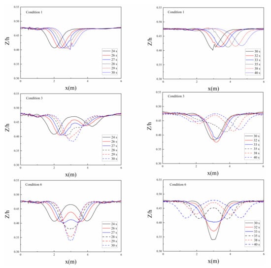 Figure 9 shows the variation in the wave surface near the riser over time for the three working conditions. For conditions 1 and 3, when the wavefront passes through the riser, the flow surface on the riser’s right side appears as folds on both wings. With the propagation of the internal solitary wave, the back end propagates to the riser, and folds appear on both sides of the riser’s upstream surface. The wave surface change in condition 1 is more evident than in condition 3. For condition 6, when the front end of the two waves passes through the riser, the riser’s wave surface is smoother than that of the single wave condition. The wave surface height around the riser decreases continuously and peaks at t = 30 s. At this time, the wave height of the upstream surface on the left and right sides of the riser is almost the same. With the propagation of the internal solitary wave, the height of the flow field near the riser increases continuously and returns to the horizontal state.
