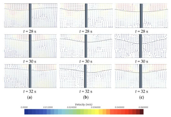 From Figure 10, whenever the internal solitary wave is layered up and down along the wave surface, the velocity direction is opposite. For the single-wave scenario (condition 1), the front end of the solitary inner wave propagates to the riser at t = 28 s, and then a vortex appears on the right side of the riser. After the trough propagates through the riser in the t = 30 s, the vortex on the right side of the riser disappears, and the vortex appears on the left side. As the wave trough propagates away from the riser, the vortex phenomenon increases on the left side.