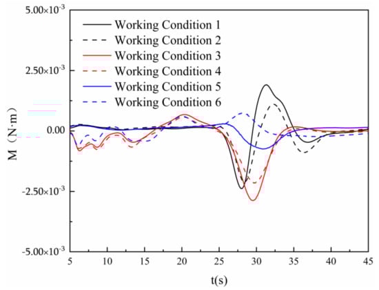 The amplitude of the internal solitary wave on the left side of the calculation domain is 7.9 cm, and the amplitude of solitary waves on the right side increases from zero to 7.9 cm. The comparative analysis of the riser’s horizontal direction (horizontal) for the different conditions is shown in Figure 11. In the image, the left wave propagation is presented in the positive direction, while the right wave propagation is at the opposite direction. The horizontal force of the riser under the combined action of the two waves is less than that of the standpipe under the single-wave condition—opposing force. The riser receives an opposing X force first, then a positive X force, and finally a tiny opposing X force. In Figure 12, when the single wave condition and the amplitude difference on both sides are small, the change law of the riser torque curve is like that of the horizontal force curve. The torque direction is the first negative, then positive, and finally negative, with two deflections in the direction. After working condition 3, the riser is only affected by the negative torque, and the peak value occurs at about t = 30 s, that is, before the two trains of waves merge into a stable single wave. With the continuous reduction in the amplitude difference between the two trains of waves, the occurrence time of the peak value of the torque goes backwards, and the extreme value of the torque also decreases.