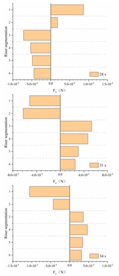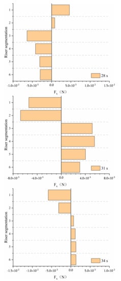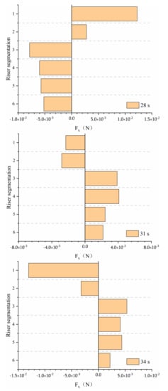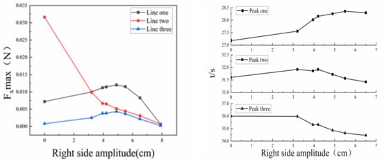 The extreme absolute force values (Fxmax) were compared for the different working conditions. In Figure 13, the opposing force in the first section is line 1, the positive force in the second section is line 2, and the opposing force in the third section is line 3. Under the combined action of two internal solitary waves, the increasing amplitude on the right side causes the opposing force on the riser in the horizontal to first increase and then decrease, while the positive force decreases continuously. The amplitude of the first negative force on the riser is greater than that of the second positive force on the combined action of two waves. For the section 3, the opposing force amplitude is small. Here, the force on the riser is dominated by the right wave since the propagation of the left wave is faster than that of the right wave.