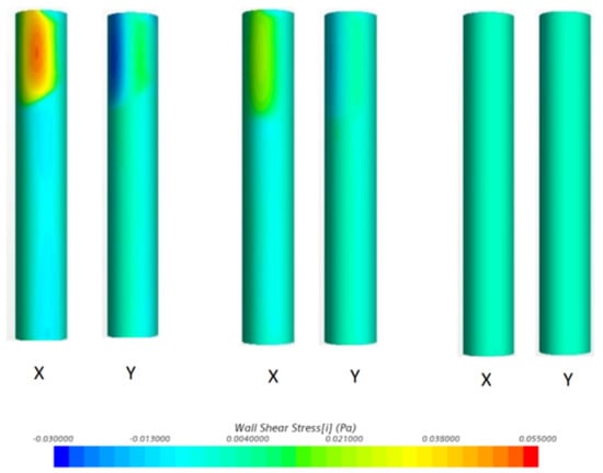 Contrast diagram of wall shear force in x and y directions of the riser (t = 30 s). From left to right: working condition 1, working condition 3 and working condition 6.
