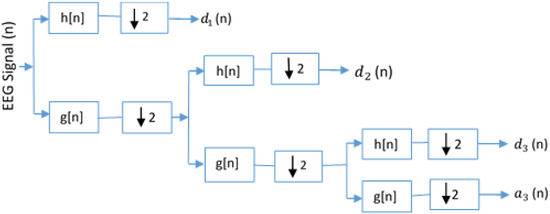 To overcome the problems associated with time-domain approaches in analyzing biomedical signals, Discrete wavelet transform (DWT) has been deployed by many researchers in analyzing physiological signals, including EEG. This is due to its ability to present a signal in the time-frequency domain suitable for analyzing non-stationary signals [31,32]. In this approach, focal and non-focal EEG signals x(n) are decomposed into sub-bands consisting of lower and higher frequency components using longer and shorter windows. These longer and shorter windows were achieved by using scaling and shifting functions on the signal. The scaling and shifting function corresponds to the low pass and high pass filters denoted as g[n] and h[n], respectively [33,34]. These low pass and high pass filters produced the details and approximation coefficients, respectively. The process of filtering and decimation of EEG signals at each level continued until it reached the last level. Figure 1 demonstrates the three levels decomposition process. At each level, the decimation is achieved by downsampling the EEG signal into half to increase the frequency resolution of the signal.