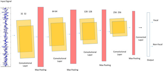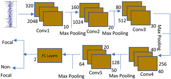 To deal with time-frequency features obtained from WT-SST transform, we also proposed the 2-dimensional-deep CNN to effectively classified the focal and non-focal EEG signals due to its efficiency in the classification of physiological signals, such as medical images and in computer vision [43,44]. The structure of the proposed deep 2D-DCNN is that it consists of five layer-convolutional, max pooling, and fully connected layers. Figure 3 shows the number of feature maps in the layers, number of neurons, input and output signals, as well as convolution and max-pooling layers. As stated earlier, in this paper, we selected the number of samples as 2048 while the frequency points were 320. At each 2D convolution layer denoted as the cth layer, the output of the feature map from that layer is and can be calculated as in Equation (8):