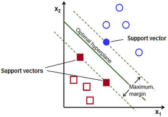 Our problem of identifying epileptogenic zone using focal and non-focal epileptic seizure signals is a binary classification, and as such, we employed an SVM classifier to classify our EEG signals. SVM is commonly used in biomedical signal analysis, especially with the problem of high dimensional feature vectors. It provides high accuracy and deals with a high number of predictors. The SVM obtained and maximized the optimal hyperplane distance from high dimension feature space and that of each class’s closest data sample. The SVM used regularization parameters to control the level of overlap between the kernel functions and each class [45,46]. An example of optimal hyperplane and the maximum margin for a two-dimensional separable problem with data points on the margin line representing support vectors are shown in Figure 4.