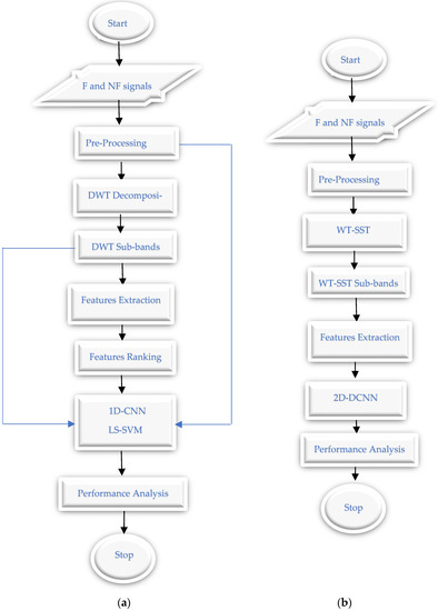 Block diagram of the proposed techniques, (a) classification of focal and non-focal EEG signals using DWT and hybrid features with SVM and 1D-CNN. (b) using WT-SST time-frequency matrix features with 2D-DCNN.