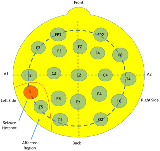 EEG signal acquisition set up using 10–20 international system with seizure hotspot shown in red colour [50].