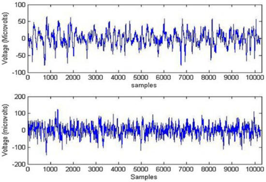 The dataset used in this study is publicly available and is known as the Bern-Barcelona database. It is recorded at the University of Bern, Department of Neurology, from five epilepsy patients that have longstanding pharmacoresistant temporal lobe epilepsy. All the patients were screened for epilepsy surgery, and before the surgery, the recording of EEG signals was conducted as one of the diagnostic procedures. The EEG recording was conducted intracranially using depth electrode and intracranial strips with an AD-TECH (Racine, WI, USA) device in a multi-channel scenario. The number of channels is more or less than 64 channels using the standard international 10–20 system with Fz and Pz as reference electrode locations. Figure 6 shows the EEG signal acquisition arrangement with seizure hotspots marked in a red colour. Focal and non-focal EEG signals were carefully inspected by two certified neurologists visually; the first detected ictal signal from the EEG channels are referred to as focal signals, while the signals from the remaining channels are termed as non-focal EEG signals [24]. Of the focal and non-focal EEG signals, referred to as x and y, 3750 pairs were acquired with a sampling frequency of 512 Hz and then filtered with a bandpass filter with a cut-off frequency of 0.5–150 Hz, with each signal consisting of 10,240 samples. One focal EEG channel was chosen at random from any patient, and another focal EEG channel from the neighboring selected channel was also selected and denoted as x and y, respectively. The details of this dataset can be found in [49]. In this work, complete sets of 3750 with both focal and non-focal signals were used in our analysis. Examples of focal and non-focal EEG signals are shown in Figure 7.
