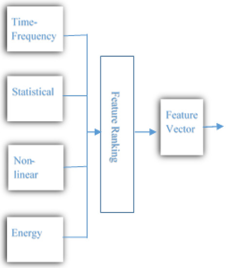 For the successful implementation of the CAD system for the detection and classification of focal and non-focal EEG signals, efficient and relevant features with low dimension but which still retain useful information are extracted. In this paper, wavelet transform has been deployed to extract time-frequency features. Afterwards, statistical parameters and nonlinear parameters were calculated to extract more meaningful features and reduce the feature dimension so that the classifier’s computational complexity would be minimized. The computational complexity is one of the factors to be considered when developing smart IoMT devices. The raw EEG signals and wavelet features contain a lot of redundancy information that can render the classification process complex and difficult. Therefore, feature ranking and selection were carried out using a t-test in SPSS software to determine the probability (p) values. Parameters with a value higher than the critical value of 0.05 are considered non-statistically significant and can be dropped from the features. Figure 8 depicts the block diagram of feature vector formation from various domains and feature ranking.