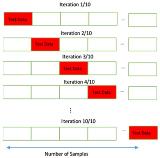To increase the performance and evaluate the validity of the machine learning classifiers, a cross-validation approach is usually employed to divide the dataset into k number of sub-sets, known as k-fold cross-validation. In this approach, the features are divided into k-fold group sub-sets with a single set selected as the test data while the remaining subsets are selected as the training data. For example, this work employed 10-fold cross-validation, the dataset is divided into 10 subsets, and at each subset, the data are sub-divided into one for test data and the remaining nine for training data, so the alteration would be carried out ten times. An example of 10-fold cross-validation is described in Figure 9.