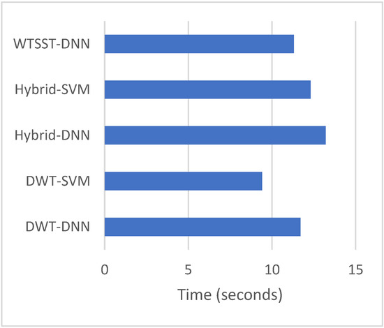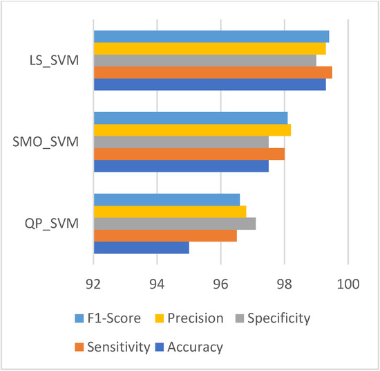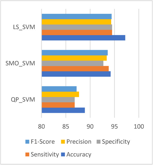 The performance of discrete wavelet features was evaluated with SVM and the 1D-CNN deep neural network with gradient descent. Different kernel functions and various types of SVM were experimented with, as depicted in Table 3 and Figure 10, respectively. From the table and Figure, it was clearly shown that LS_SVM with polynomial kernel function performs better than other kernel functions and SVM types with an accuracy, sensitivity, and specificity of 97.2%, 94.5%, and 94.5%, respectively. Table 4 shows the comparison of the performance of the deep learning network with the best SVM classifier, where the former outperforms the latter with 98.8%, 97.3%, and 97.7% for accuracy, sensitivity, and specificity, respectively.