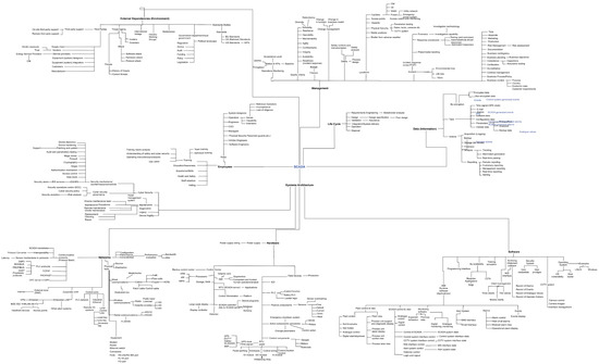 Through this rigorous process, the unified mind map of a SCADA system was gradually refined. Overall, the final version of the unified mind map comprises 610 elements. Figure 1 shows an early version (work in progress) of the unified mind map. This figure is presented here to demonstrate the richness of the model, not to show the individual elements, which will be discussed in detail in Section 5.