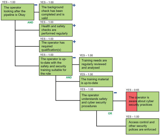 In a DM, there are two types of relationships between child nodes of one parent node: and and or. An and relationship means that all child nodes should be successful for the success of a parent node. An or relationship indicates that at least one child node should be successful for the success of a parent node. An or relationship reduces overall risk, while an and relationship increases it. An OR relationship may be used to introduce a cyber security countermeasure which mitigates a risk posed to a system by a certain dependency.