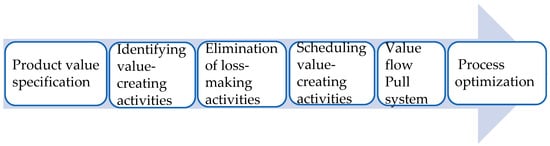 The application of the Lean production concept in different companies and organizations [23,24] “has shown the world the differences between value-creating activities and waste, and has demonstrated how we can incorporate quality in products, from the inside out” [25] in order to develop innovative products and services and to meet customer demands. Since the emergence of Lean philosophy, the authors, Womack et al. (1990) [4] and Jackson and Jones (1996) [26], have developed manuals for the implementation of Lean principles in production, containing the main steps and ways of action, as outlined in Figure 1.