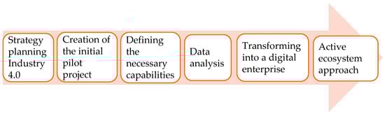 Recent specialized studies [49,50,51] have estimated that switching to Industry 4.0 will lead not only to technology changes but also to changes in business models, followed by social changes. Certain difficulties faced by industrial companies when implementing Industry 4.0 have arisen, even at the operational level of production floors [52] such as human resource training issues for learning new digital skills and competences, human–machine integration, and data security. It is necessary to have the best possible knowledge of industry practices so that the adaptation of current Lean management methods to smart manufacturing can be carried out efficiently. Reference [53] proposed a methodology that outlines general guidelines for the implementation of an Industry 4.0 project, and the steps are shown in Figure 2.