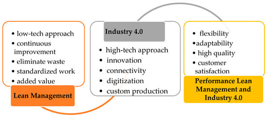 A literature review regarding the development of the two manufacturing concepts aimed to analyze the current principles and relationship between Lean management and Industry 4.0 for the purpose of generating a useful conceptual integration framework applicable to industry. In the analyzed context, there is a need and opportunity to develop in-depth research in this cutting-edge, booming field in order to identify the benefits regarding the increase in system performance. Mainly, this concerns the synergistic development of digitalization and connectivity in Industry 4.0 and the Lean principles to ensure efficient, sustainable and waste-free manufacturing in the future.