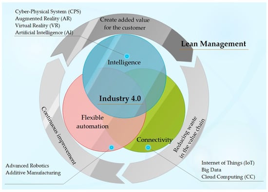 Seen from a technical perspective, Industry 4.0 brings major changes in technology, but it does not exclude principles to identify added value and eliminate waste, which are typical of Lean management. Integrating Lean methodology and tools into the new industry represents a challenge for any company wishing to adapt its processes in order to increase performance, both at the operational and the organizational levels, through digitalization and connectivity. Through Lean manufacturing, solutions can be found to certain problems in terms of organizing and managing new high-end technologies implemented through Industry 4.0 such as cyber–physical systems (CPS), the Internet of Things (IoT), robotics, artificial intelligence (AI), additive manufacturing (AM), big data analytics and human–machine interfaces (HMI). Simultaneously, through its solutions and intelligent processes, Industry 4.0 contributes to meeting customer demands by offering customized, quality products (smart products), thus meeting the demands of Lean manufacturing regarding value creation for the end user.