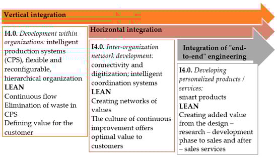 The implementation of Industry 4.0 in production systems can be achieved in three directions of integration [64]: vertical integration, horizontal integration and “end-to-end” engineering integration. Reference [17] states that “the principles of I4.0 are the horizontal and vertical integration of production systems driven by real time data interchange and flexible manufacturing to enable customized production”.