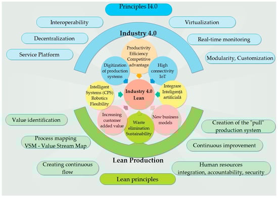 It is noted that the principles of Industry 4.0 and Lean manufacturing can be interwoven in order to support company development by generating positive effects on productivity, efficiency and performance. The companies that have implemented Lean management in manufacturing exhibit an openness to switching to Industry 4.0, having already developed a culture of improvement, and they are more receptive to change. They consider that the new Industry 4.0 technologies can contribute to achieving the main Lean goals of reducing and eliminating waste by developing intelligent and value-creating processes, digitalization and connectivity. The approach to the association of Lean practices with the complex technologies of Industry 4.0 requires the development of a framework model that provides an efficient technical–managerial integration and organizational culture.